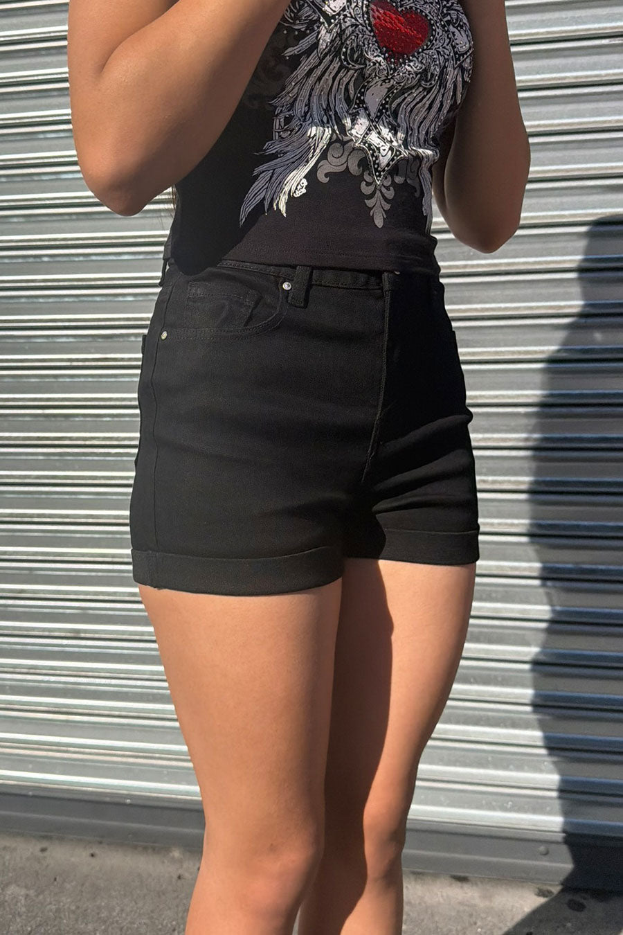 - Style Description: WAXJEAN Basic Black Denim Shorts With Rolled Cuff with Great Stretch