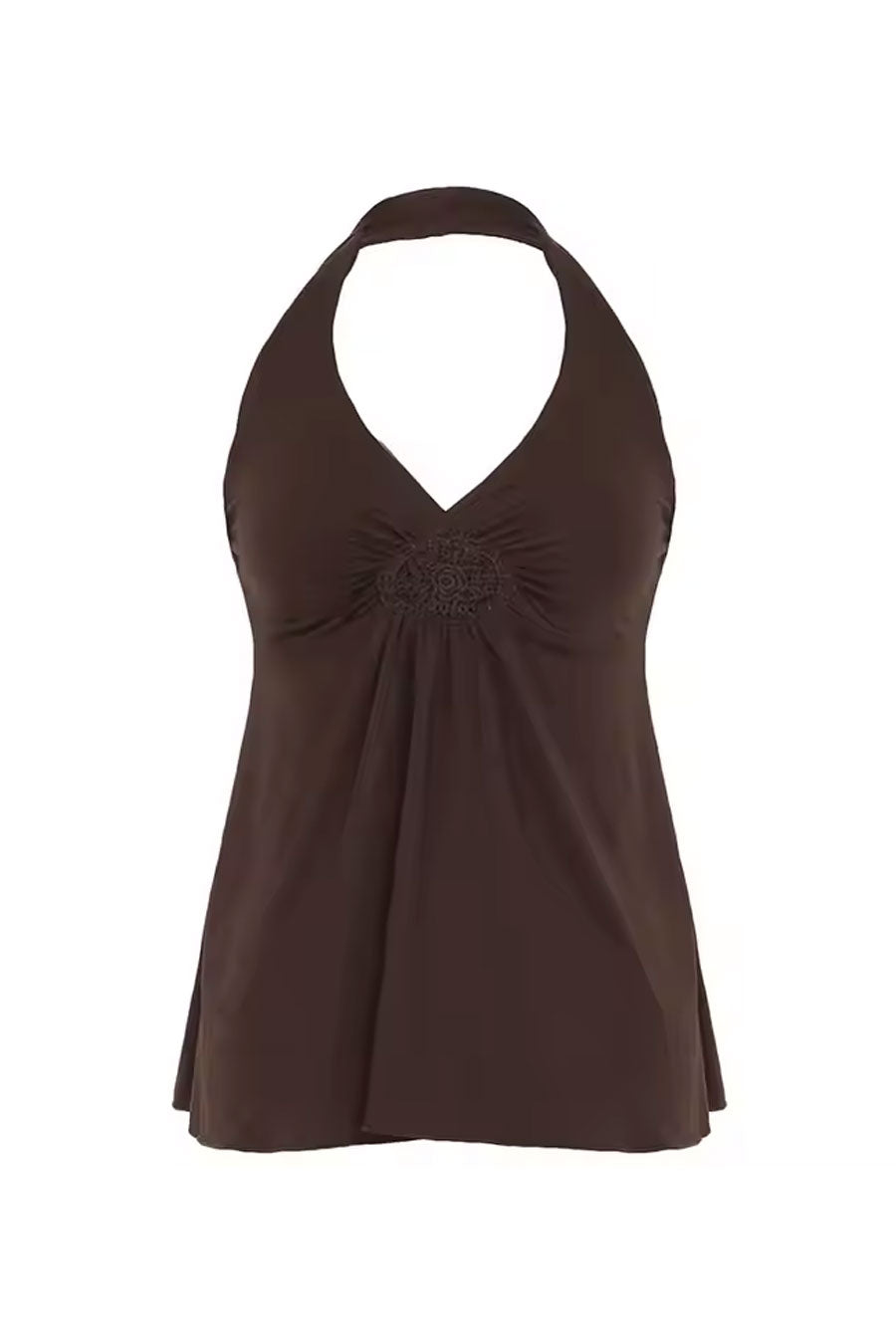 - Style Description: Y2K 2000s Vintage Halter Flare Top with Floral Patch Detail